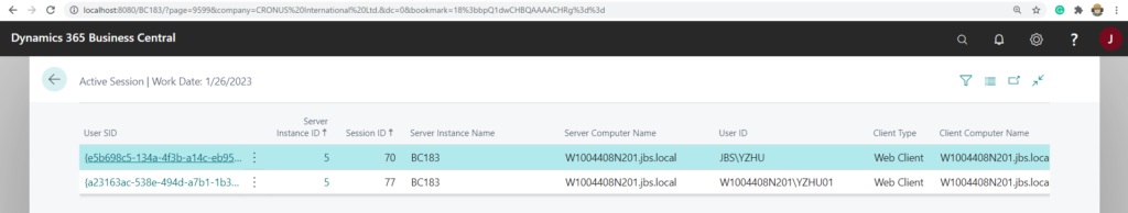 - Access: This is done by modifying the Business Central URL to force the client to display the contents of a specific table. The table in question is system table 2000000110 "Active Session".