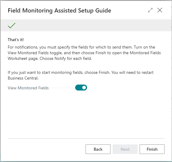 - Launch the Setup Wizard: Use the search function in Business Central to find and open Field Monitoring Setup. This will launch the assisted setup guide.