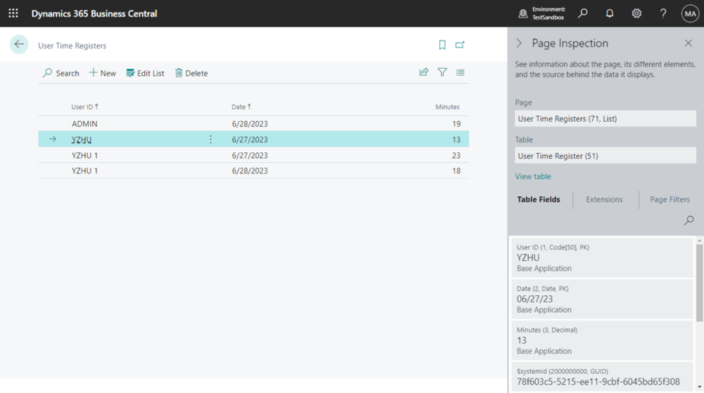 - View the recorded times. To see all recorded login times, open the User Time Registers page. One way is to use the Search (Tell Me) box and type User Time Registers. On that list page, you’ll see columns for User ID, Date, and Minutes (the duration in minutes the user was logged in that day). Each row shows one user’s total logged-in time for a date. This lets you report on or audit how much time users spent in Business Central each day.